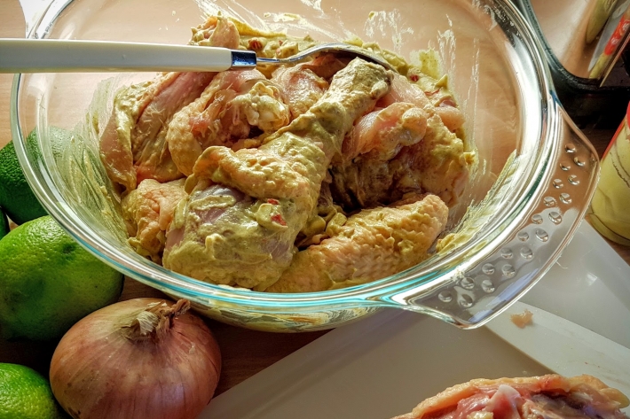 Placez les morceaux de poulet dans un saladier et versez la marinade dessus. Remuez le poulet dedans et ajoutez les oignons.