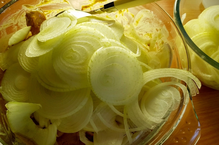 Au moment de cuire le poulet, retirez les rondelles d’oignons.