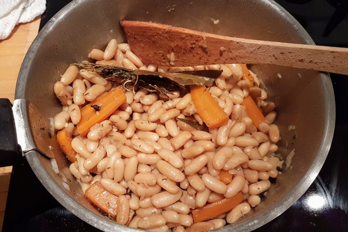 Quand l’oignon a commencé à colorer, versez l’ail et les mogettes et faites-les dorer légèrement sans eau (comme un risotto).