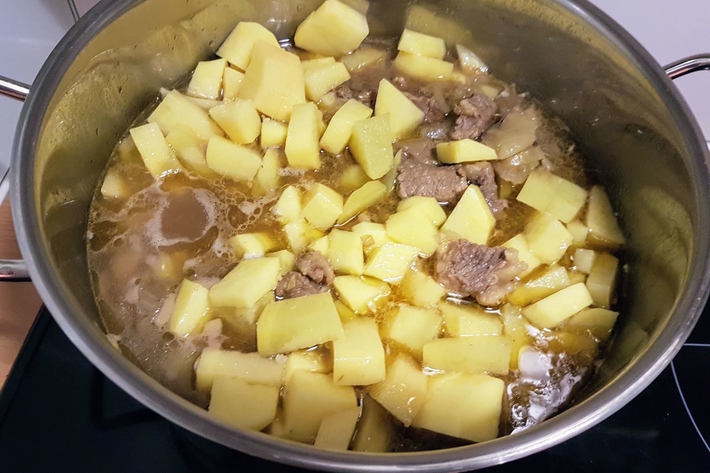 Mélangez bien les ingrédients dans la cocotte avant d’ajouter le reste des pommes de terre, ainsi que le reste de bouillon.
