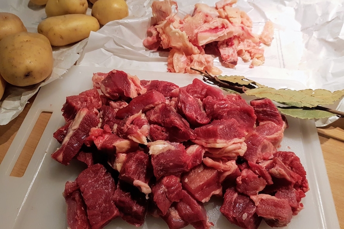 Coupez la poitrine de bœuf en dés après avoir retiré l’excès de gras et l’os.