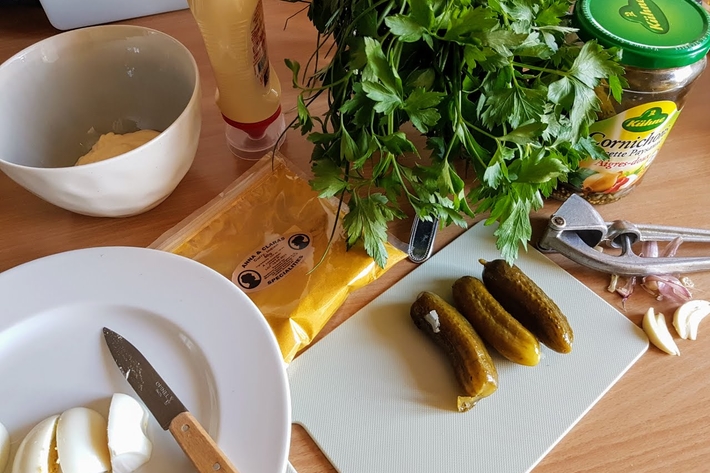 Versez la mayonnaise dans un bol, ajoutez-y les œufs durs écrasés, les cornichons hachés, le curry, le sel de céleri et pressez l’ail au-dessus.