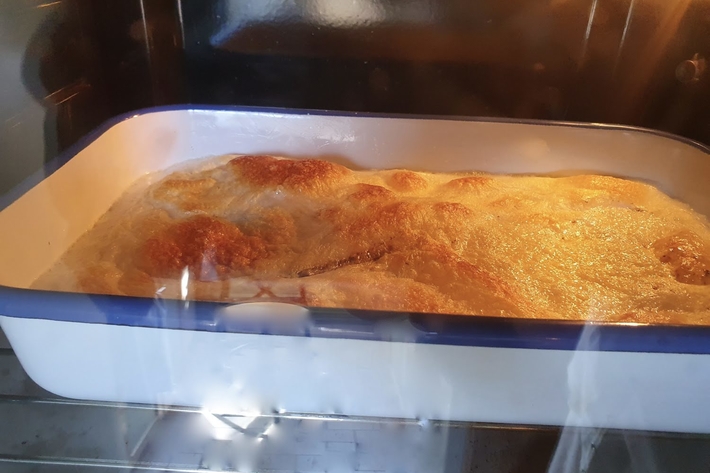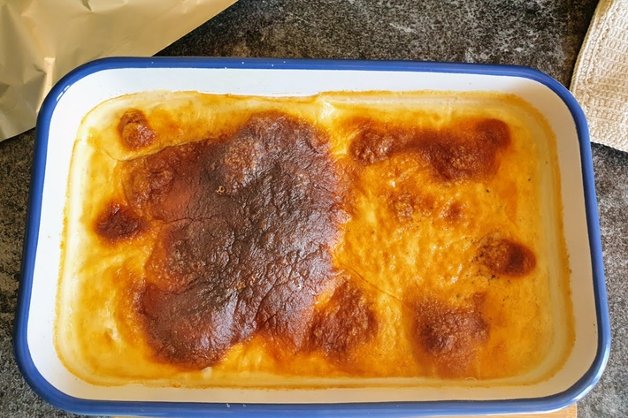 Enfournez 2 heures. Le lait forme une pellicule blonde. Si elle fonce trop (après environ 1h15-1h30 de cuisson), recouvrez d’un papier d’aluminium.