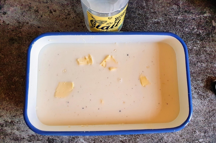 Versez le lait et parsemez de copeaux de beurre.