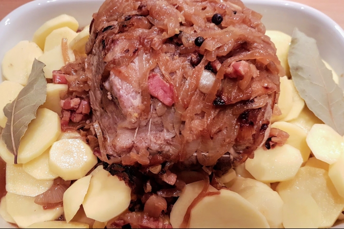 Ajoutez les pommes de terre et le genièvre dans le plat à four après la première heure de cuisson.