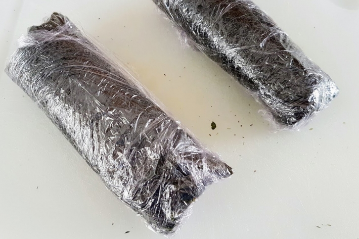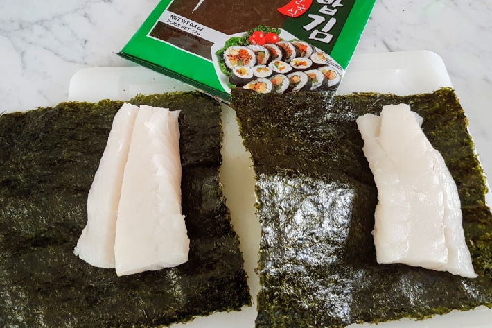 Posez-les sur chaque feuille de nori, découpez aux ciseaux le morceau d’algue qui déborde et enroulez le poisson dans cette feuille d’algue.