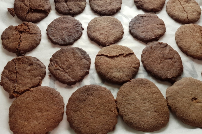 Étalez la pâte sur une feuille de silicone (ou le plan travail, idéalement en marbre, fariné), sur une épaisseur de 5 millimètres (pas moins) et formez des sablés avec un emporte-pièce d’environ 5 centimètres de diamètre (Pierre Gagnaire parle de 8 centimètres, mais la pâte est si fragile que ce n’est pas prudent et vous en aurez davantage). Déposez-les délicatement, avec la lame d’un couteau sur une feuille de papier cuisson. Autre solution moins jolie, mais sûre : roulez des petites boules de pâte entre les paumes de vos mains et aplatissez-les.