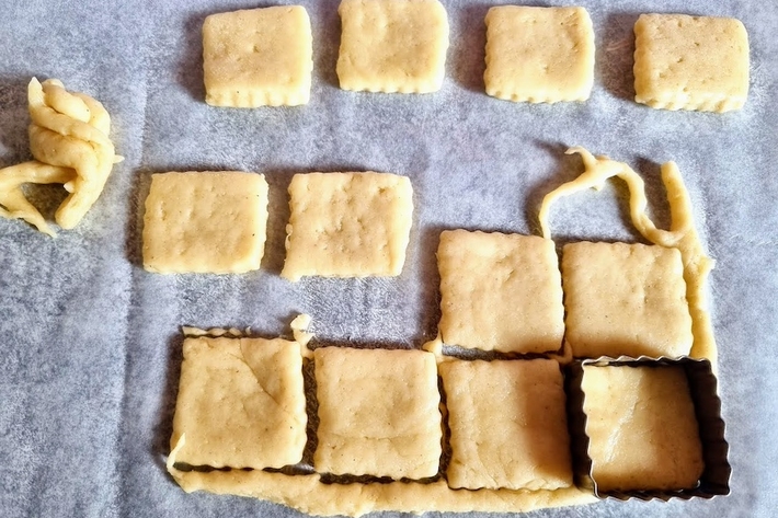 Formez des biscuits carrés grâce un emporte-pièce (évidemment, vous pouvez quadriller la pâte à l’aide d’une roulette crantée ou même une lame de couteau).