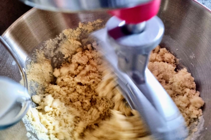 Pétrissez le tout en versant progressivement le lait tiède jusqu’à former une pâte homogène.