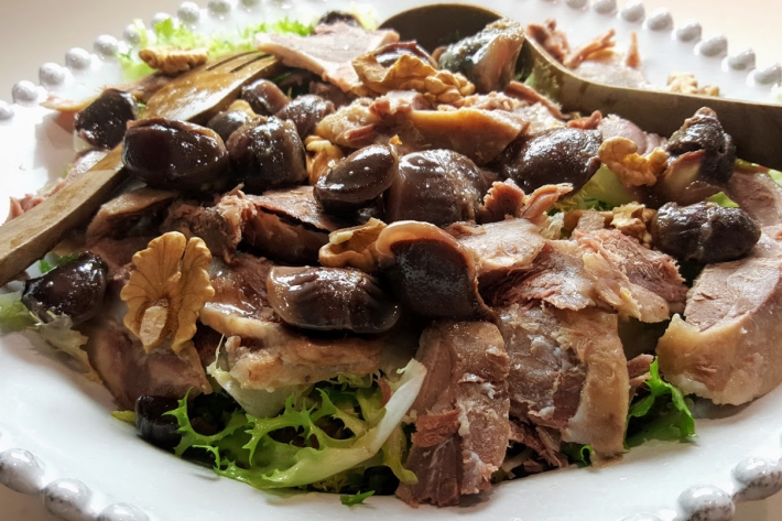 Rien de plus simple que de s’asseoir tous autour de lamelles de confit froid dans une belle salade à l’huile de noix, avec un petit vin périgourdin. Les noix et le confit, c’est divin. Et, froid, curieusement, le confit semble moins lourd… Il est vrai qu’ainsi préparé, on en mange moins.