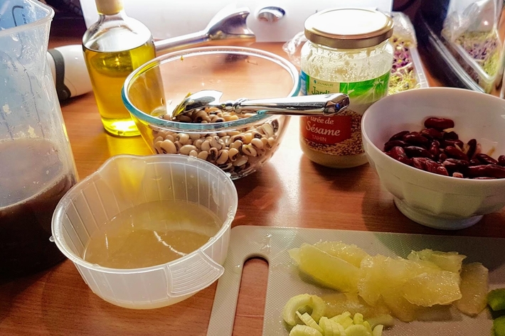 Vous pouvez avoir préparé toute cette partie à l’avance : trempage des haricots un soir jusqu’au lendemain matin et cuisson des haricots le matin (pendant le petit déjeuner). Les finitions se feront le soir.