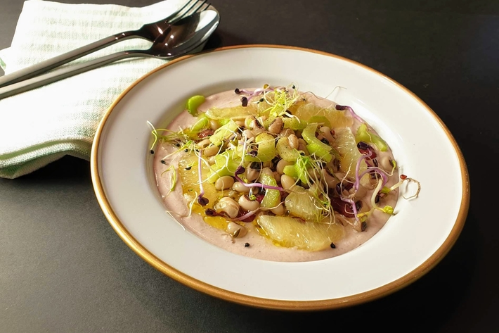 Répartissez la crème de haricots rouges dans chaque assiette creuse et déposez dessus les haricots rouges restants , les cornilles, le céleri et les suprêmes de citron.
