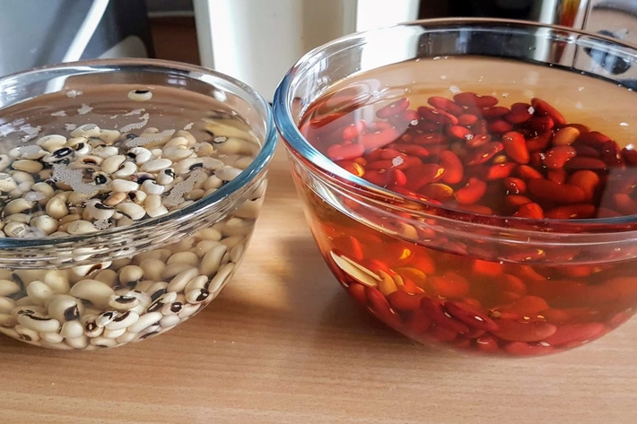 La veille, faites tremper les haricots (à température ambiante) séparément dans 6 fois leur volume d’eau.