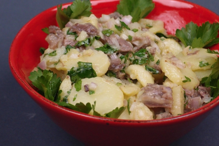 Rien n’est meilleur que cette même salade mélangée à des cubes de viande froide avec les restes de bœuf bouilli d’un pot-au-feu ou de queue de bœuf. Vous pouvez même y ajouter des rondelles de cornichons.