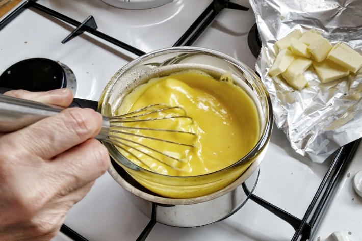 Faites chauffer ce bain-marie sans cesser de remuer et en incorporant très progressivement les morceaux de beurre jusqu’à absorption de tout le beurre.