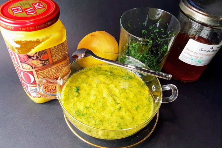 Voici la sauce moutarde aigre-douce, comme celle de chez Ikea ! Elle accompagne classiquement le poisson gravlax : cabillaud ou saumon ou les harengs. À la place de la Savora, sachez que la moutarde alsacienne (“condiment”) est encore mieux. Il est bien rare que cette sauce vous reste sur les bras…