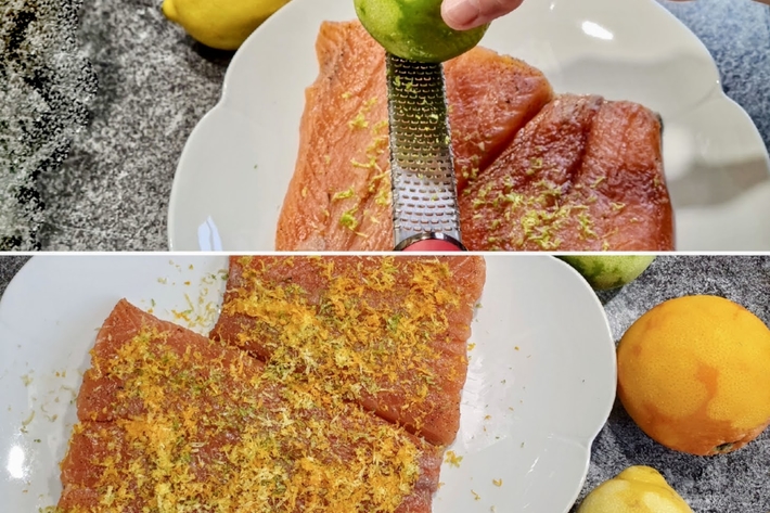 Râpez le zeste des trois agrumes sur la chair du poisson, faites bien adhérer et gardez-le encore 24 heures (on arrive à 72 heures), côté chair aux agrumes contre le plat.