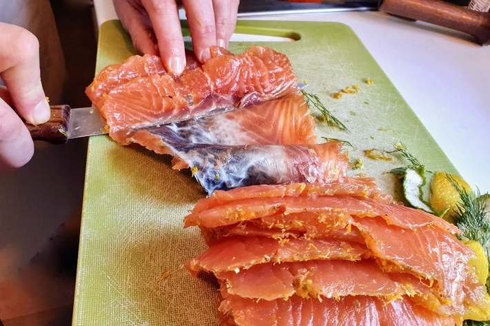 Déposez le saumon sur une planche, côté peau vers le bas, et faites de fines tranches avec un bon couteau, comme un couteau à jambon.