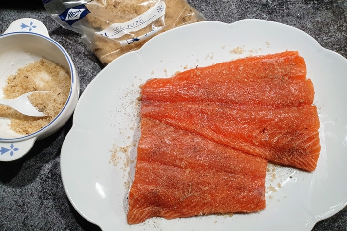 Mélangez le sel et le sucre dans un bol et recouvrez-en complètement le saumon.