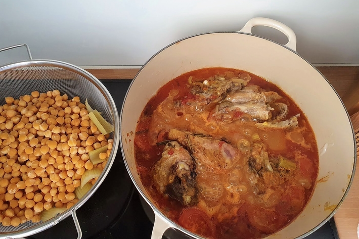 Plongez alors les pois chiches précuits dans le ragoût et remettez à mijoter une demi-heure.