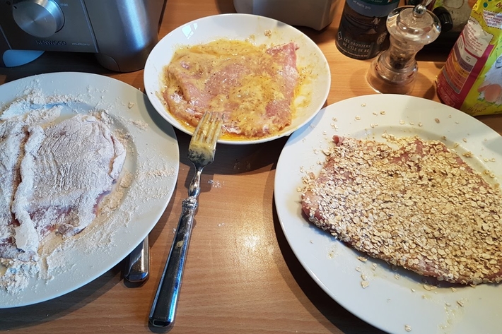 Passez les escalopes recto-verso, une par une, dans la farine, puis dans l’œuf moutardé, puis dans les flocons d’avoine en appuyant avec les doigts pour que les flocons adhèrent le mieux possible.