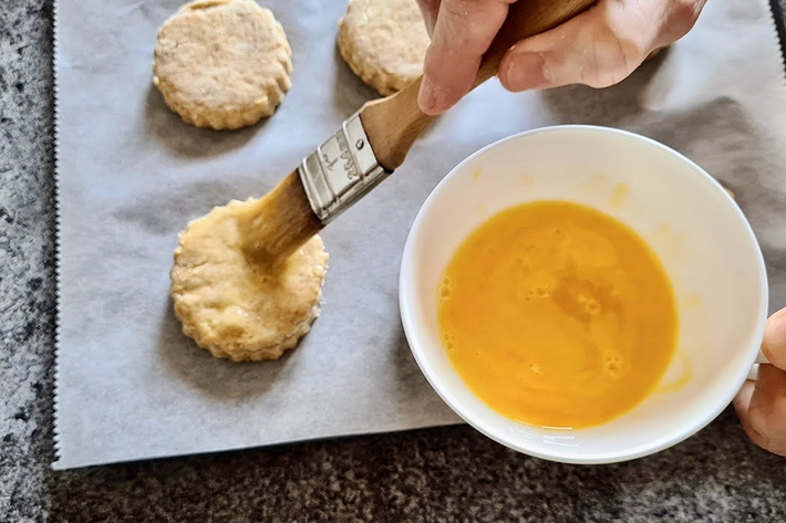 Battez l’œuf à la fourchette dans une tasse et, à l’aide d’un pinceau, badigeonnez le dessus des scones crus avec cet œuf battu.