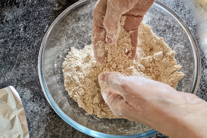 Si ça vous paraît difficile à faire, procédez avec le robot, mais le beurre ne doit pas fondre. Arrêtez-le dès que vous obtenez une sorte de sable, puis reversez dans le saladier. Mais, franchement, ce n’est rien à faire à la main.
