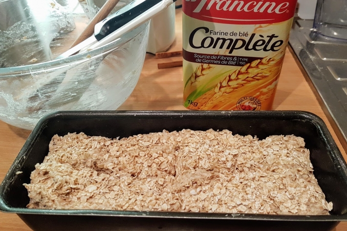 Dans un moule à cake, comme il est plus haut, le pain cuit 45 minutes (en baissant la température du four à 200° après 10 minutes), sans le retourner.