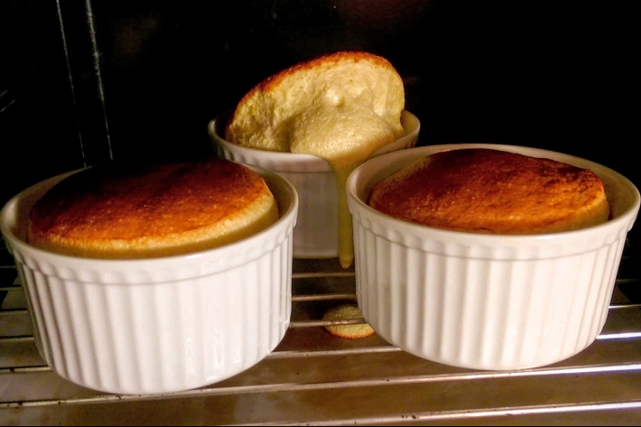 “Préparez le mélange jaunes d’œufs-sucre à l’avance de façon à garder les blancs à température ambiante suffisamment longtemps pour qu’ils montent mieux. Montez les blancs en neige après le plat de résistance et glissez au four quand vous pouvez tabler sur 8-10 minutes avant de déguster les soufflés. Ne les mettez pas trop tôt. Mieux vaut attendre un peu la fin de la cuisson que le contraire. Les convives patienteront sans difficulté.