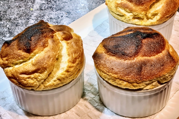 4 moules à soufflé individuels de 11 centimètres de diamètre (ou moins, mais de cette taille, ils vous serviront pour les soupes à l’oignon gratinée aussi)