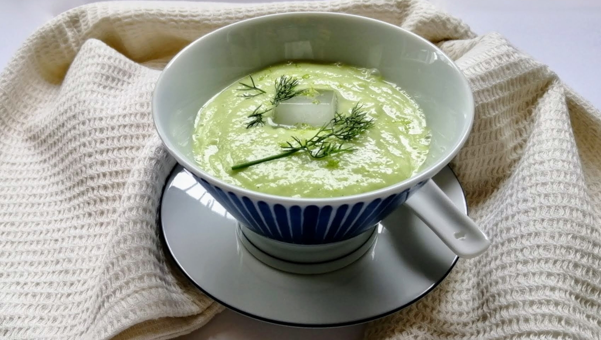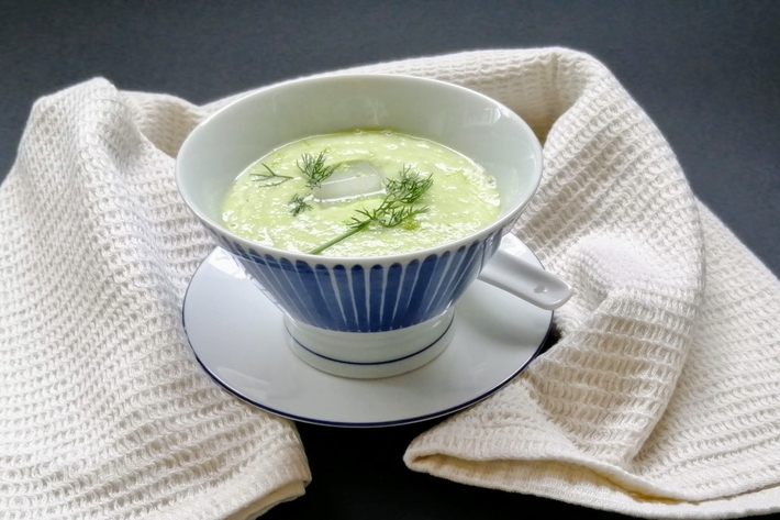 Répartissez le velouté dans des bols individuels, des coupelles ou des verrines, ajoutez au besoin un glaçon, ainsi que quelques pluches d’aneth et servez.