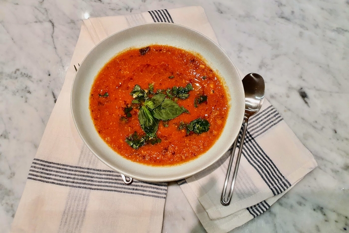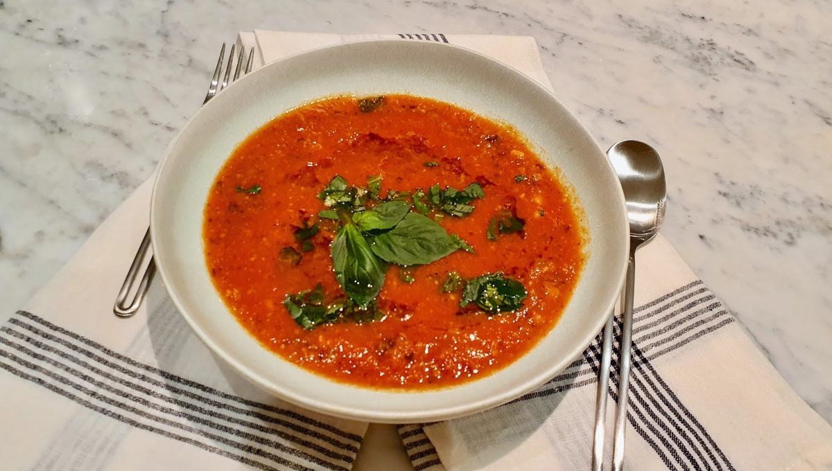 Répartissez la soupe dans de jolies assiettes, parsemez de coriandre ou basilic avec l’ail pressé cru, ajoutez un filet de bonne huile d’olive et servez immédiatement bien chaud.
