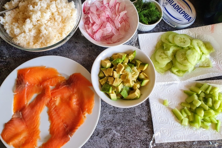 Déposez une cuillerée à café de riz, puis un peu de poisson et/ou un tronçon de concombre ou d’avocat, et/ou un peu de fromage.