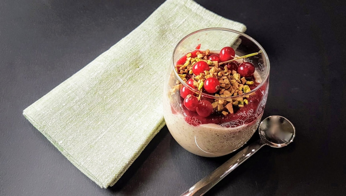 Décorez avec une grappe de groseilles sur chaque verrine et saupoudrez de pistaches torréfiées hachées.