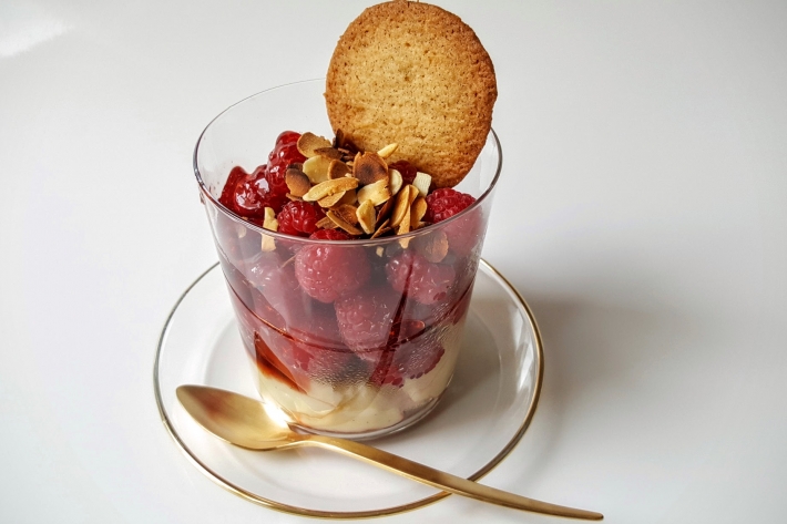 “Pour un dessert encore plus express et plus hivernal, à la place des framboises fraîches, utilisez une bonne confiture de framboises et le tour est joué !”