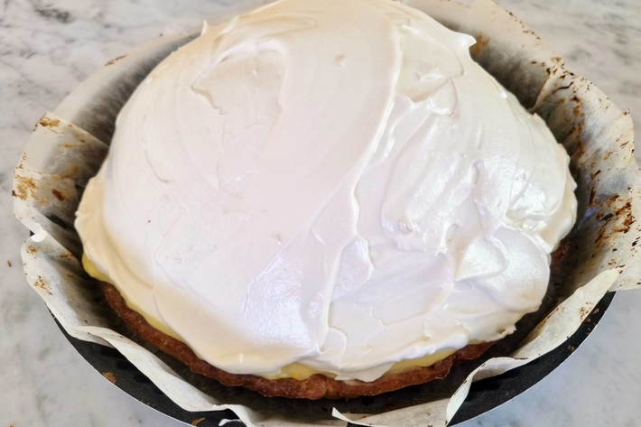 Étalez la meringue dessus à l’aide d’une spatule en plastique en lui donnant une forme bombée au centre.