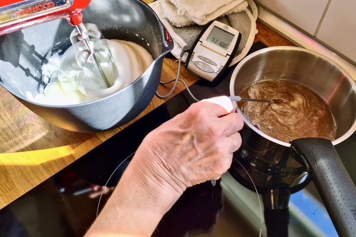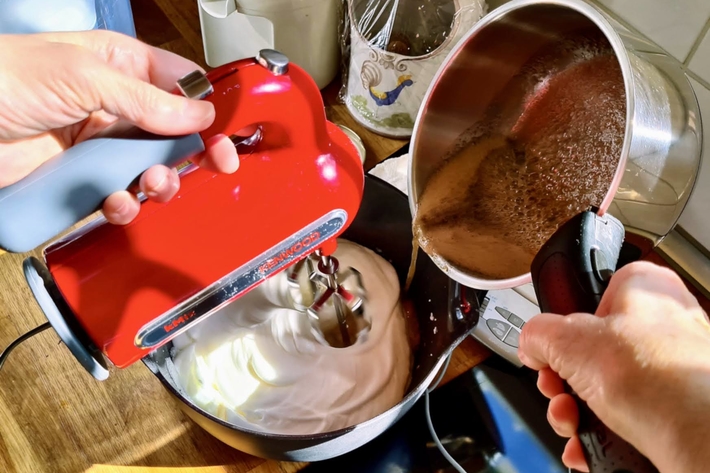 Versez le sirop de sucre en un mince filet sur les côtés des blancs en neige sans cesser de fouetter jusqu’à ce que la meringue refroidisse (comptez une dizaine de minutes).