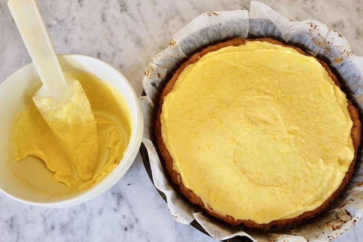 Garnissez le fond de tarte avec la crème au citron (qui, en refroidissant, s’est bien raffermie).