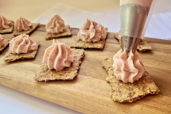 Pressez la poche à douille pour déposer des petits tas de mousse de jambon sur chaque morceau de crackers ou de pain.