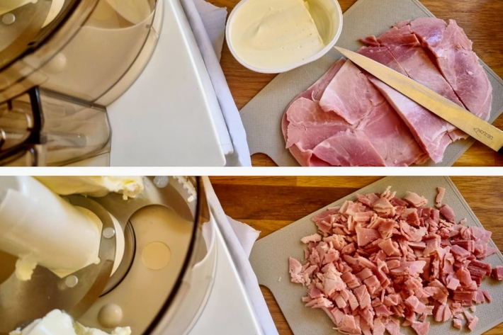 Placez le jambon dans le bol de votre robot avec le fromage frais, du poivre et, éventuellement, du thym (ou de la ciboulette ciselée).