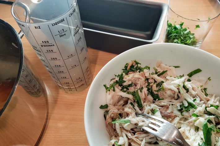 Tassez ce mélange dans une terrine, couvrez d’un film et posez un poids dessus.