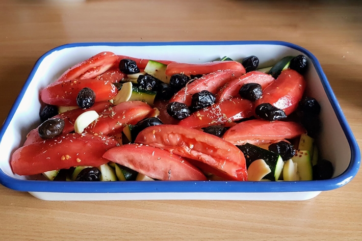 Étalez les les oignons, puis les courgettes, les tomates, les gousses d’ail entières et les olives.