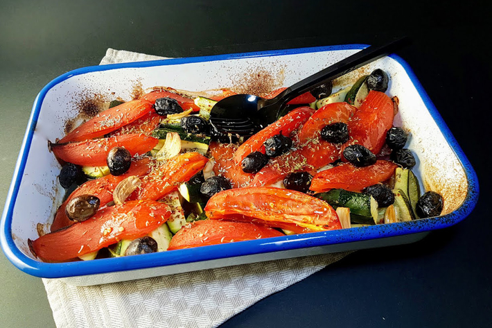 Toujours fan du site de Carole, Alter Gusto, et de courgettes, voici son plat de courgettes et tomates rôties, pleines de saveurs d’été mêlées avec un peu de vin blanc. C’est tout simple et plein de soleil, voilà tout.