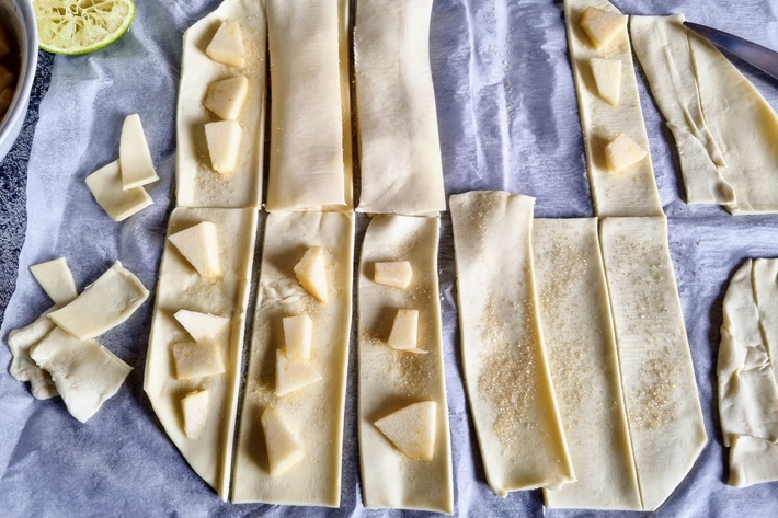 Répartissez les morceaux de pomme sur deux bandes de pâte sur trois. Saupoudrez d’un peu de sucre.