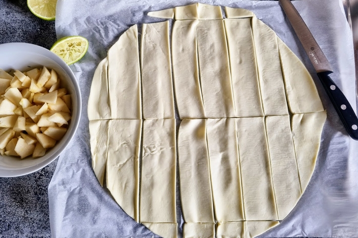 Empilez l’une sur l’autre deux bandes avec de la pomme, puis recouvrez d’une bande sans pomme.