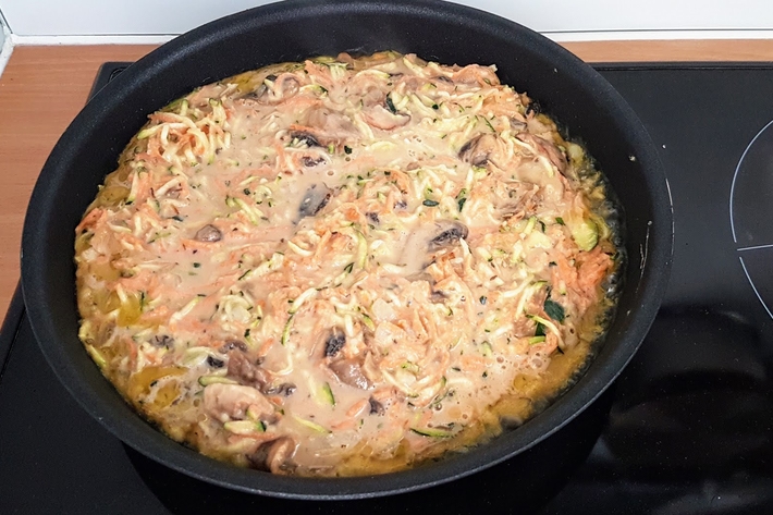 Versez la fin de l’huile dans la poêle, laissez chauffer et versez le mélange.
