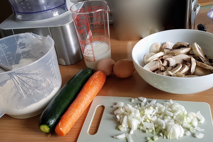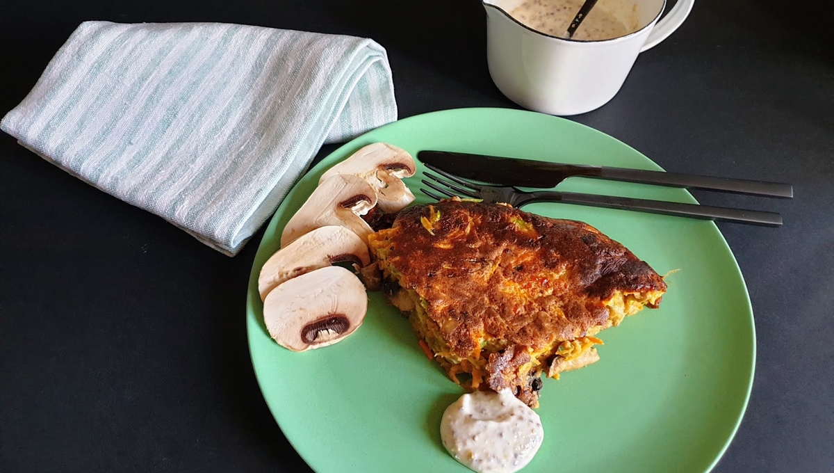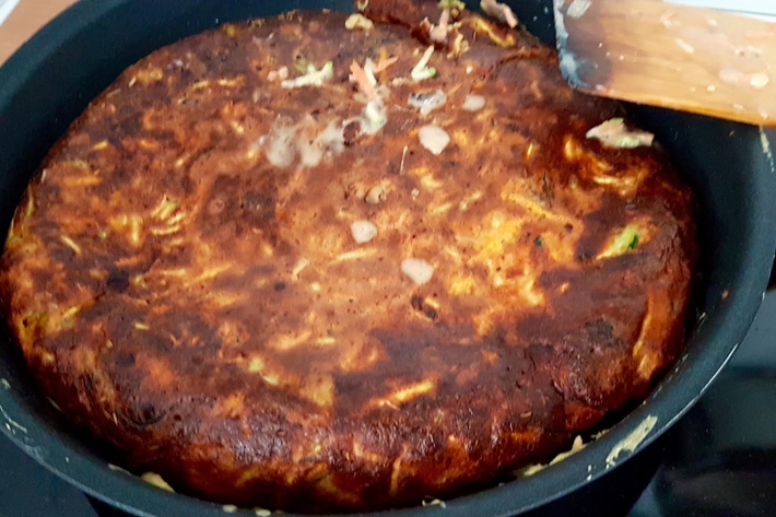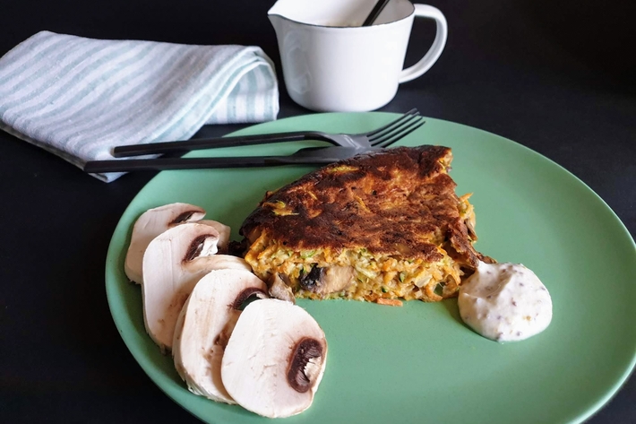 Cette recette dénichée sur un site autrichien (gusto.at) est une déclinaison du Kaiserschmarren, mais aux légumes et salé. Une sorte de crêpe un peu grossière, idéale pour un petit dîner léger. Au lieu de déchiqueter cette crêpe, je l’ai laissée entière, genre tortilla. Dégustez-la tiède plutôt que chaude. Ou froide, découpée en carrés ou losanges pour l’apéritif.