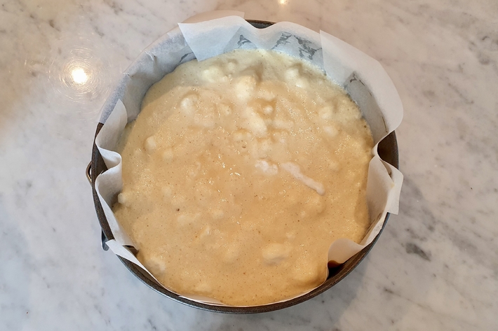Versez la pâte dans un moule à manqué beurré et tapissé de papier sulfurisé.