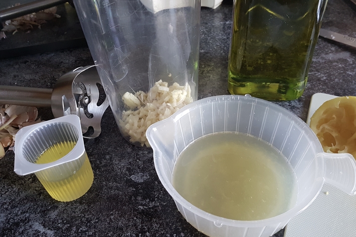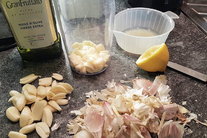Écrasez l’ail dans un bol mixer en hauteur pour le réduire en purée avec un mixer plongeur (ou au mortier).