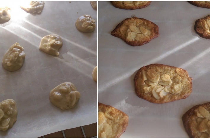 Avec une cuiller à café, déposez des petits tas de pâte, suffisamment espacés, sur une feuille de cuisson en silicone (posée sur une grille du four) ou bien du papier sulfurisé.